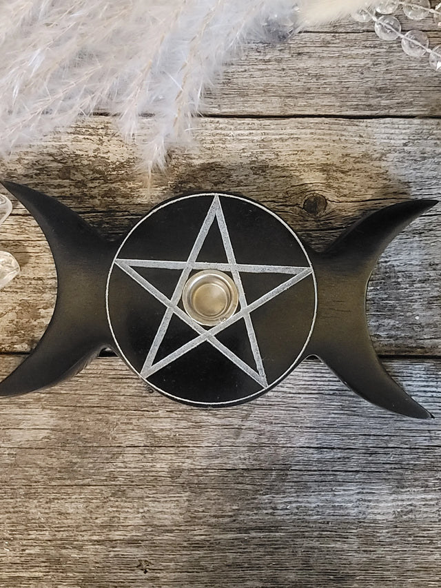 Soapstone Mini Candle Holder Triple Moon w/ Pentacle - Black