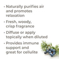 Juniper Berry, famously known as the berry from which the alcoholic spirit Gin is obtained, is an essential oil well-known for its calming effects on nervous tension. Diffused into the air, it can be used as a natural purifier and is great to use during meditation by promoting a calming atmosphere. When applied diluted to the skin, Juniper Berry produces skin warmth which may help ease the discomfort of a strenuous workout. Diluted in carrier oil and rubbed on the legs, it can assist with feelings of congestion or tightness.