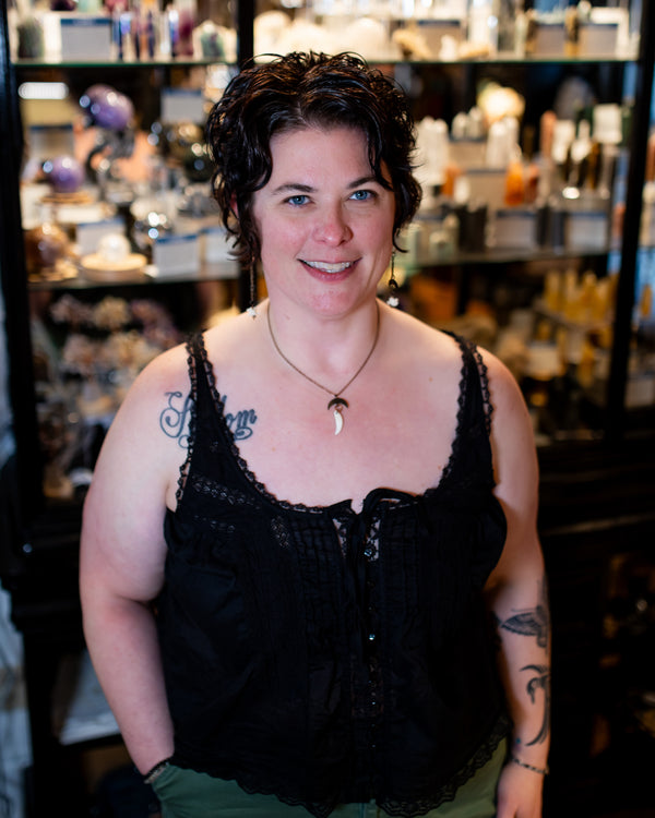 Kat is our resident Norse-hearted soul and a calming force within the Wild Raven’s Nest. As a Reiki practitioner and passionate student of Norse traditions, she leads our rune workshops with curiosity and care, never claiming mastery, but always inviting discovery. Whether tending her garden, hanging with her dog Tyr (named for the Norse god of war and justice), or co-teaching with her husband Andrew, Kat embodies the quiet wisdom of living close to the land and the old ways. Around the shop, she keeps us grounded, especially when our founder starts flying too close to the sun.